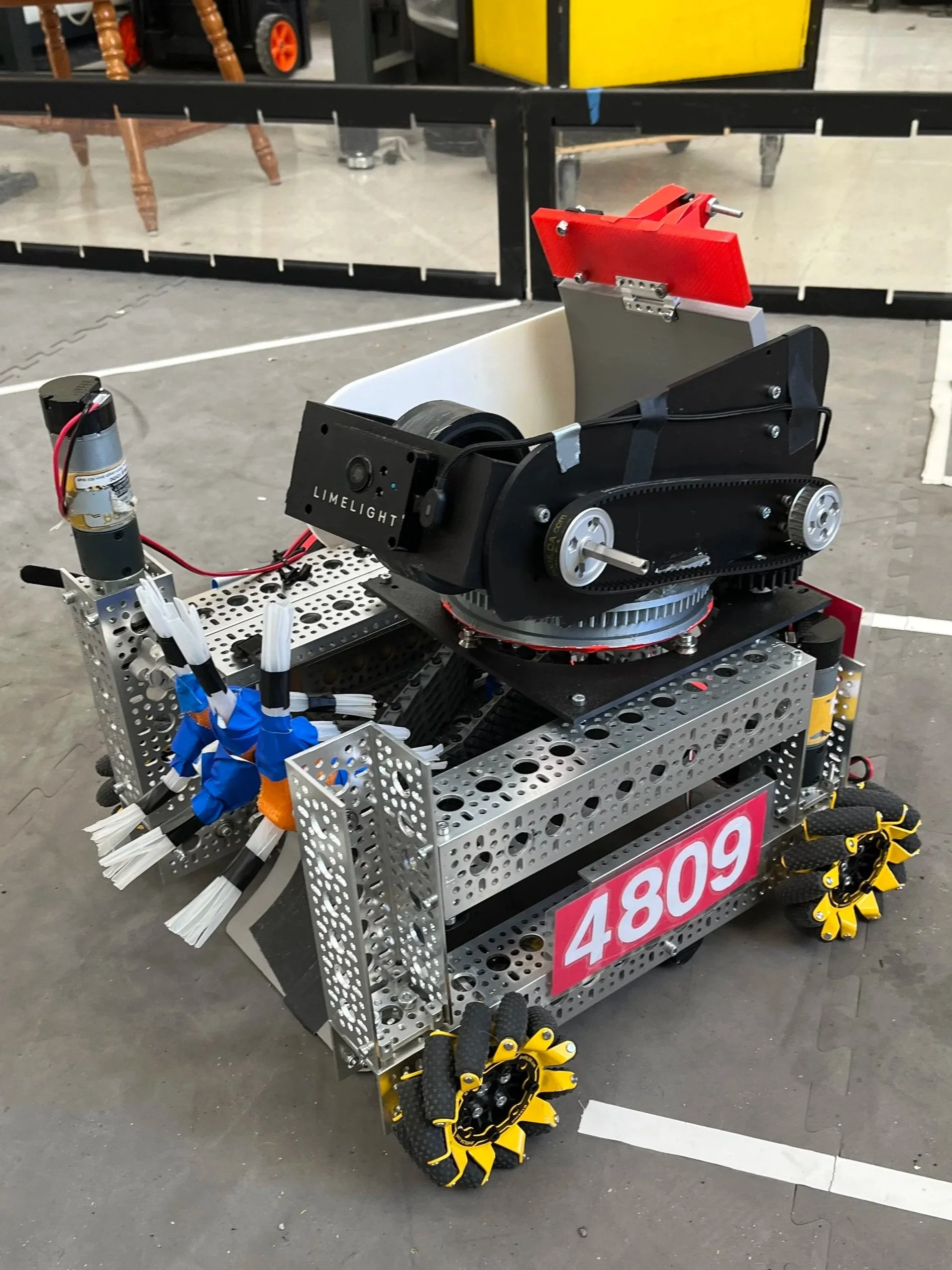 The intake was changed to use surgical-tube spokes in order to more effectively pull Artifacts into the robot; the Transfer Kicker was streamlined into being more reliable and avoiding jamming; and the Hood was redesigned to be able to cover a wider range of angles and be sturdier overall.