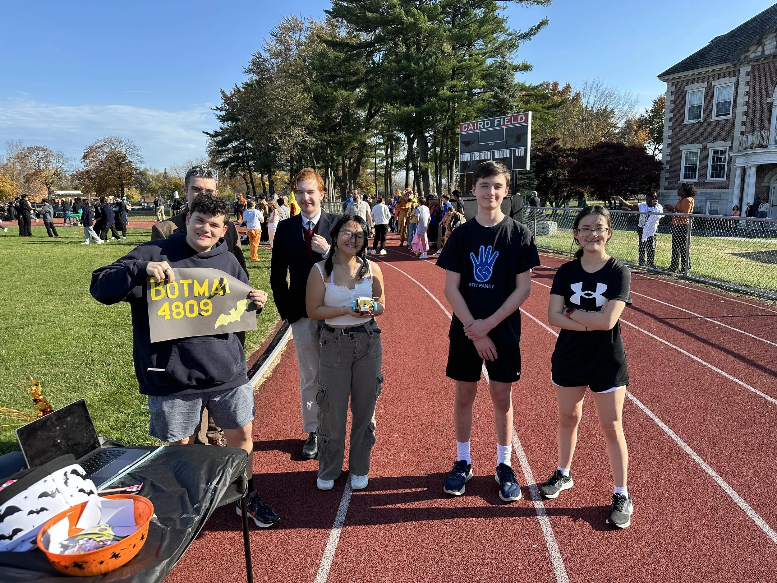 Every year, Botman hosts a table at our school’s annual track or treat, held on Halloween. Track or Treat is for our lower schoolers, who walk around the track in their costumes, collecting candy from tables hosted by upper school clubs. We bring Spike Kits and a Lego robot, that they can drive, to get kids interested and excited about the FLL team.